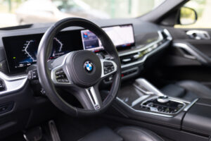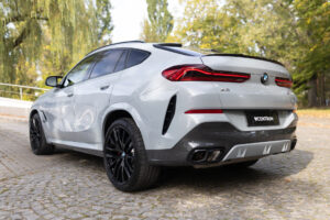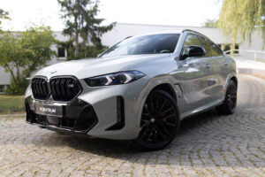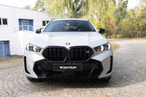BMW X6 M60i xDrive z 2024 roku w kolorze Szary Brooklyn M to połączenie luksusu, sportowych osiągów 530 KM oraz najnowszych technologii BMW. Bogato wyposażony egzemplarz z wnętrzem BMW Individual Merino Black, kupiony w polskim salonie i objęty pakietem serwisowym Service Inclusive do 2029 roku.