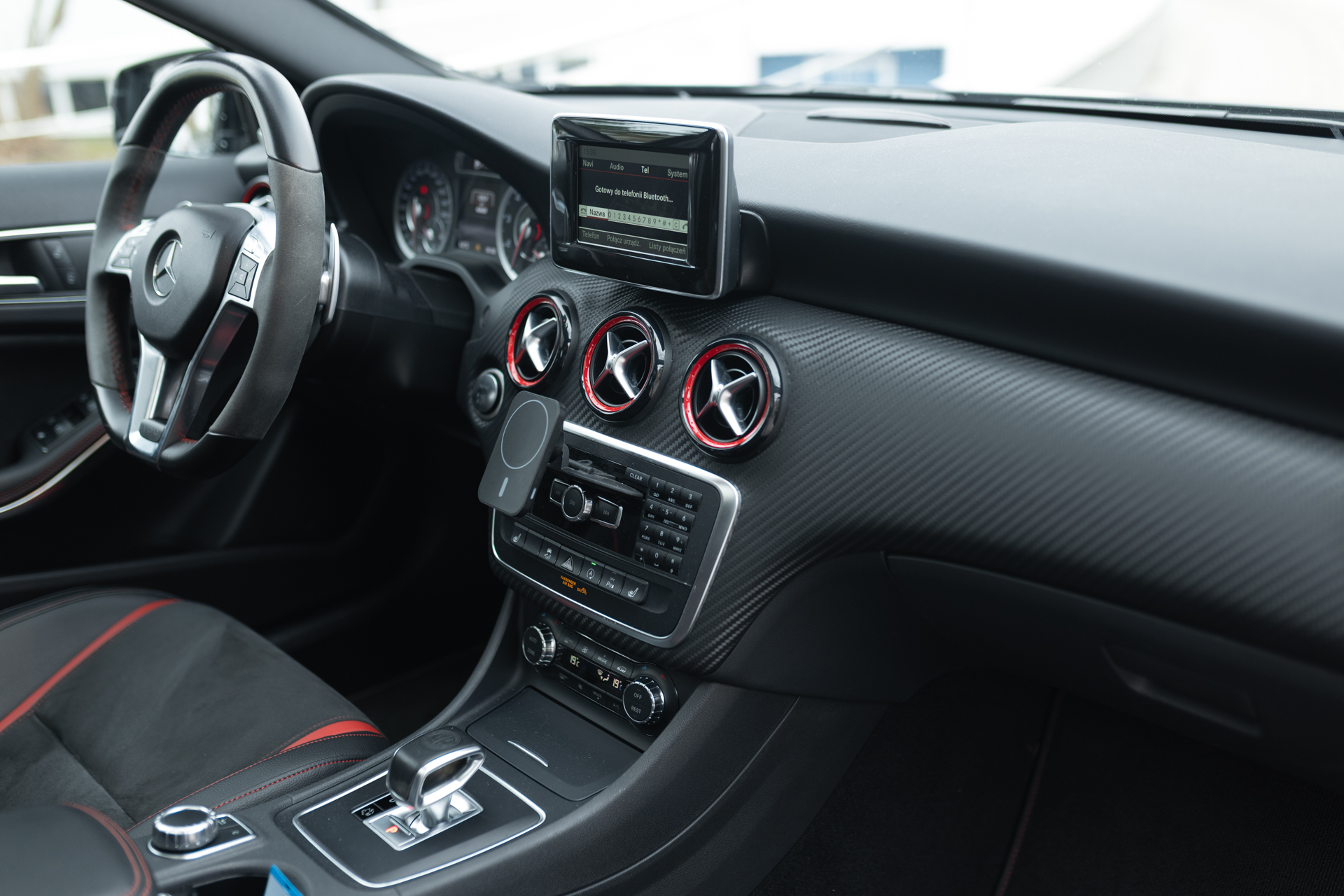 Czujnik deszczu Felgi aluminiowe 19 AMG Panoramiczne okno dachowe Sportowy układ wydechowy Spryskiwacze reflektorów Tempomat zawieszenie sportowe AMG-Styling - spojler przedni progi boczne Fotele AMG-Performance Kierownica AMG Performance Lusterko wsteczne i lusterka wewnętrzne automatycznie przyciemniane Lusterko zewnętrzne elektrycznie składane ogrzewane spryskiwacze szyby Ogrzewanie foteli kierowcy i pasażera Pakiet dodatkowego oświetlenia Poszerzenie nadkoli Reflektory biksenonowe Układ kontroli ciśnienia w ogumieniu (RDK)